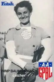 Baumgartner, an All-Star and member of two champion teams, was a competent catcher during the last years of existence of the All-American Girls Professional Baseball League. Known more for her glove work than her bat, behind the plate is where she really shone. Defensively, Baumgartner was a solid receiver with a strong throwing arm who worked well with pitchers and was able to handle a running game. She also was adept at blocking balls in the dirt and catching errant pitches, important in a league that progressively expanded the length of the base paths and pitching distance and decreased the size of the ball until the final year of play. In six years of career, she committed only 59 errors in 1,128 total chances, for a significant fielding average of .950.[2][3]