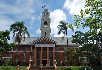 The original township of Maryborough was situated, not in its current place, but on the north of the Mary River, after wharves were established in 1847–1848, to provide transport for wool from sheep stations on the Burnett River. In 1852 the growing town was gradually transferred further north where ships were able to better navigate the river. Development followed and by March 1861, Maryborough was declared a municipality, the Borough of Maryborough, and Henry Palmer was appointed as the first Mayor. Meetings of the newly formed Council were held in various buildings until 1874 when a timber Town Hall was constructed, adjacent to the School of Arts in Kent Street. A Deed of Grant had been issued for the land in 1868 but construction of the building did not occur for several years. During the late 1860s and 1870s Maryborough developed rapidly as the port for the nearby gold rushes in the Gympie area. The new town hall, which was erected for about £400 was opened in 1876, although not finished until 1879.[1][2]
