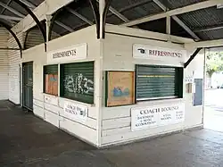 The first (south-east) portion of the original refreshment room was built in the 1890s, and may have been a lamp room beforehand. It was doubled in size in 1909, and was closed in 1968. It has since been used for storage. A new refreshment booth was built to the south-east in the 1990s, under the main platform verandah.[1]