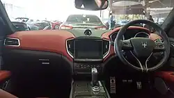 The Ghibli uses a customized version of the Uconnect infotainment system found in other FCA vehicles like the Dodge Charger. Buyers have different leather upholstery for the interior to choose from. An Alcantara headliner, a premium Harman Kardon or Bowers and Wilkins sound system, wood, carbon fiber and optional metal and weaved leather interior inserts and steering wheel are available as an option.[7]