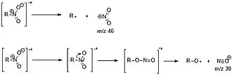 The aliphatic nitro compounds normally show weak molecular ion peaks, while the aromatic nitro compounds give a strong peak. Common degradation mode is loss of NO+ and NO2+.[6]