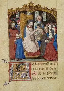 His style was studied in 1935 in a monograph devoted to one of his books of hours, the Un livre d'heures: manuscrit à l'usage de Mâcon, but no connection was made with his other works.[1] In 1982, American art historian John Plummer compiled a list of four of his works, including the Siraudin hours and a pontifical in the Morgan Library and Museum in New York. He then located his activity in Burgundy.[2] On the occasion of the publication of a work devoted to the Livre des faiz monseigneur saint Loys in 1990,[3] François Avril gave him a conventional name, the “Maître du Cardinal de Bourbon”, about Charles II de Bourbon, archbishop of Lyon and cardinal, who commissioned the work. The French historian located the work in Paris and added three other books of hours to the artist's list of works. He completed the corpus with two new manuscripts in 1993.[4] Finally, Isabelle Delaunay, in her thesis defended in 2000, further completed the corpus with the help of François Avril, and compared it with various engravings. She proposed its identification and location in Rouen.[5] In 2010, Yolande Fouquet-Réhault defended her thesis on the anonymous master, clarifying his style, influences, and commissioners.[6] In the 2015 art history thesis on the Parisian bookseller Antoine Vérard, Louis-Gabriel Bonicoli extended Delaunay's conclusions concerning the engravings associated with the Master or his workshop and proposed new attributions along these lines (the resulting corpus amounts to 868 matrices, produced between 1485 and 1497).[7]