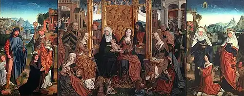 His notname is derived from a shuttered altarpiece at the Wallraf-Richartz-Museum in Cologne, created c.1503. The central part of the triptych is a holy kinship scene, with Saint Catherine and Saint Barbara, which also makes it a mystical marriage tableau.[1] It was commissioned, presumably for donation to a church, by Nikasius Hackeney, a tax administrator at the Imperial Court, and includes donor portraits of him and his family.