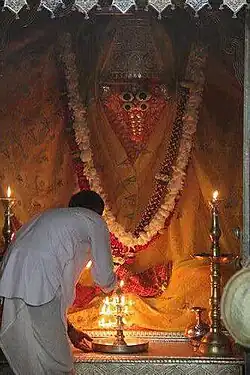 The image of Ashapura Mata in the shrine is a red-painted stone, about six feet high and six feet broad at the base, narrowing to a point in a shape, with some rough likeness to a human form. It is said to have come from Jashod in Marwar. Here every year during the Navaratri, the Rao of Cutch used to offer a sacrifice of seven male buffaloes.[1] The practice of animal sacrifice has been stopped.[6]