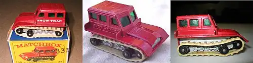 3 versions of the same mid-1960s Matchbox Snow Trac toy, all designated#35, yet each a variation: While the model pictured in the middle has the words "Snow-Trac" cast into the sides, the first has plain-cast sides and "Snow-Trac" decals; the third version has plain sides and no brand badging