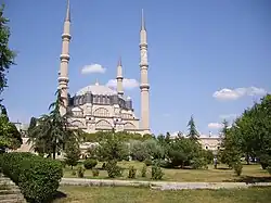 The Selimiye Mosque in Edirne, Turkey, was built by Mimar Sinan to provide a space where the mihrab could be seen from anywhere inside the building. The very large central space is accordingly arranged as an octagon, formed by eight enormous pillars, and capped by a circular dome of 31.25 metres (102.5 ft) diameter and 43 metres (141 ft) high. The octagon is formed into a square with four semidomes, and externally by four exceptionally tall minarets, 83 metres (272 ft) tall. The building's plan is thus a circle, inside an octagon, inside a square.[73]