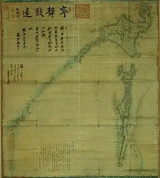 Having reached as far as what is now Ajigasawa at the northern end of Honshū, he was unable to cross over to Ezo due to strict restrictions on travel imposed by the Matsumae Domain, turning back instead to Rikuzen Province.[6][7] In 1845, at the age of 28, for the first time he crossed the Tsugaru Straits, to Esashi, which he left disguised as a merchant, travelling the length of the island for the next seventh months: he walked, with local Ainu as his guides, along the southern Pacific coast from Hakodate to the tip of the Shiretoko Peninsula, where he erected a marker inscribed "Ise Province, Ichishi District, Kumozu River, South: Matsuura Takeshirō" (勢州一志郡雲出川南 松浦竹四郎), before making his way back again to Hakodate, and thence to Edo.[5][6][7] The following year, attaching himself as manservant Unpei (雲平) to Nishikawa Shunan (西川春庵), he walked from Esashi along the Sea of Japan coast to Sōya, crossing from there to Karafuto, where they traversed the island and explored the east and west coasts of the southern end of what is now Sakhalin.[5][6][7] Crossing back over the Sōya Strait, parting company, he walked the coast of the Sea of Okhotsk to the Shiretoko Peninsula before returning to Sōya by boat, then overland via Ishikari, Chitose, and Yūfutsu back to Esashi, and thence again to Honshū; while in Esashi he met Confucian scholar Rai Mikisaburō (ja), the two competing each to compose a hundred poems and carve a hundred seals in one day.[5][6] Three years later, in 1849, on his third Ezo expedition, he sailed from Hakodate to Kunashiri and Etorofu.[7] He had now covered the whole of the north.[6] In the words of Frederick Starr, "these journeys were epoch-making", with results of geographic, literary, and political significance.[6] Again, "cartography for those regions practically dates from Matsuura".[6] For this, equipped only with a pocket compass, he relied on his own pacing combined with observation from high points.[6] At the same time, as well as active study of the Ainu language, he was becoming increasingly alive to the plight of the Ainu at the hands of unscrupulous traders and agents of the Matsumae Domain.[2]