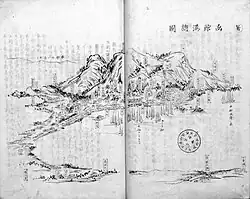 Under the new shōgun Tokugawa Iesada, and with the situation in Ezo in light of Russian activity increasingly a priority, the significance of his endeavours began to receive recognition from the top: in 1855 he was given ten ryō of gold by the bakufu, with twice as much arriving in the next few days from Tokugawa Nariaki, daimyō of Mito Domain, and Date Yoshikuni, daimyō of Sendai Domain.[5][6] He received instructions to travel to Ezo again, this time as an employee of the bakufu, for further work on its geography, to investigate its mountains and rivers, and the potential for new roads.[5] Over the next three years, three visits would ensue—indeed, one theory sees those earlier not as private initiatives, but operations in the pay of the bakufu, connecting this to the obstacles placed in his way by the Matsumae Domain.[5] Joining the expedition headed by Mukōyama Gendayū (ja), he completed a circuit of the island, travelling clockwise from Hakodate, also crossing the Sōya Strait to the northern regions of Ezo, as far as what is now Poronaysk, on Sakhalin.[5] Mukōyama died along the way, Matsuura himself so ill that he composed a death poem.[5] The following year, abandoning plans for further investigation of Sakhalin, he followed the courses of the Ishikari and Teshio Rivers, from their mouths to their upstream regions.[5] His final visit, in 1858, included investigation of the interior of the centre and the east of the island, around Akan.[5][7] His surveys covered both physical and human geography, and suggestions for the development of the land and the advancement of its inhabitants.[6] Records of these three years run to 117 volumes, while he also aimed at a wider audience through works such as Ezo Manga and a series of travelogues full of detail on the local mountains and rivers, flaura and fauna, and the customs, legends, and material culture of the Ainu he encountered along the way.[5] Sympathetic to their plight, his 1858 Account of the People of Ezo in Recent Times (近世蝦夷人物誌), which includes their sufferings at the hands of traders and officials of the Matsumae Domain, was refused for publication by the Hakodate bugyō.[5]