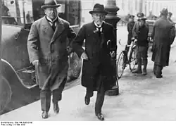 The denunciations of the conservative and national liberal press went beyond the ordinary limits of party polemics. The Tägliche Rundschau observed, in allusion to Erzberger's appearance, "he may be as round as a bullet, but he is not bullet-proof".[3] These attacks climaxed in Erzberger's murder on 26 August 1921 in Bad Griesbach, a spa in the Black Forest (Baden), while he was out walking with his friend and Centre Party colleague Carl Diez.[26][1] The pair were accosted in broad daylight by two men armed with revolvers who "fired shots at Erzberger's head and chest. Erzberger leaped down the slope by the road, but three further shots hit him in his lung, stomach, and leg. The murderers then ran down the slope themselves and fired more shots at him. Diez was also hit in the chest, but was able to return, bleeding, to the hotel and relate what had happened."[27] Because Erzberger signed the armistice of 1918, many on the political right regarded him as a traitor. Manfred von Killinger, a leading member of the Germanenorden, masterminded his killing by recruiting two members – Heinrich Tillessen and Heinrich Schulz – of the ultra-nationalist death squad Organisation Consul. The assassins were former Imperial German Navy officers and members of the disbanded Marinebrigade Ehrhardt.[28] Erzberger's assassins were later smuggled into Hungary and were prosecuted only after World War II.[2][29] His funeral turned into a political rally, at which one of the speakers was Joseph Wirth.[1] Erzberger is buried in the Catholic cemetery of Biberach an der Riss.