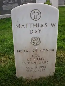 Matthias W. Day (August 8, 1853 – September 12, 1927) was a career American army officer who received the Medal of Honor, the United States' highest military decoration, for his actions during the American Indian Wars in the latter half of the 19th century. Day was a longtime officer with the African-American 9th Cavalry Regiment, seeing action during the Apache Wars against the Apache leaders Victorio and Geronimo.