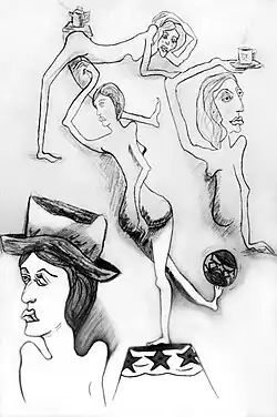 “The very unalike images you see here are however alike in one highly specific way, which is that they connect directly to Matuschka's art-making beginnings, including her very earliest. The animate blobs, shapes and quasi-figural bits and pieces that populate her abstractions, for instance, owe a debt to a childhood fixation on the TV star, Soupy Sales, who would doodle haphazardly on a chalkboard as in a classroom, then ask his audience to seek out potential images of creatures or whatever lurking in his scribble-scrabble and complete them."- Anthony Haden Guest[48]