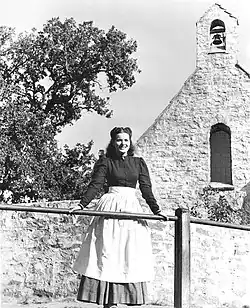 In 1952, O'Hara played Claire, the daughter of the musketeer, Athos, in At Sword's Point, which according to her showed the "new Maureen O'Hara".[129] The film had actually been made in 1949 but was not released until 1952.[12] The role was the most physically demanding of her career, doing her own stunts and training in the art of fencing for six weeks under Belgian-born fencing master Fred Cavens.[130] She disliked director Lewis Allen and producer Howard Hughes, whom she thought was "cold as ice".[131] The critic from The New York Times appreciated O'Hara's swordsmanship in the film, stating that she was "snarling like a Fury, impales her opponents as though she were threading a needle."[132] O'Hara next played Irish immigrant Australian-based cowgirl, Dell McGuire, in Lewis Milestone's drama Kangaroo (1952), set during the drought of 1900. Kangaroo is noted for being the first Technicolor film to be shot on location in Australia,[133] mostly shot in the desert near Port Augusta. Although O'Hara disliked the production due to changes made to the script,[134] she found the Australians extremely welcoming.[135] The Australian government offered her a plot of land during the production to own permanently, but she turned it down for political reasons, only to later discover that significant oil reserves were on the land.[136]