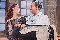 In 1945, O'Hara starred opposite Paul Henreid in The Spanish Main as feisty noblewoman Contessa Francesca, the daughter of a Mexican viceroy.[85] O'Hara described it as "one of my more decorative roles",[86] as her character is a particularly aggressive one among the men on a ship, and during the course of the film her face is smothered in chimney soot.[87] O'Hara almost did not win the role when another actress falsely told RKO executive Joe Nolan that she was "as big as a horse" after giving birth to a daughter in 1944.[88] Around this time "an actress named Kathryn" also falsely accused O'Hara of making sexual advances towards her in an elevator, which she believed was a way for the actress to gain attention at the start of her career.[89] During the production of The Spanish Main, O'Hara was visited by John Ford, who was initially turned away for being shabbily dressed, but was later admitted. He informed her about the project that would become The Quiet Man (1952). Malone notes that in the film O'Hara "shows her determination not to leave her sexuality at the birthing stool", commenting that she looks "deliciously fragrant in the splashy histrionics on view here, in RKO's first film in the three-color Technicolor process"[88] O'Hara became a naturalized citizen of the United States on 24 January 1946,[7] and held dual citizenship with the United States and her native Ireland.[90]