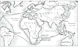 Benyovszky's Memoirs state that the route taken by the ship, having rounded the southernmost point of Kamchatka, was generally north and eastwards, taking in Bering Island, the Bering Strait, Alaska, and the Aleutian Islands.[29] However, in the time available (four weeks according to Benyovszky's own account), this 6000-mile itinerary is barely credible for a leaky ship and inexperienced crew. Such a route is completely absent from three other separate accounts of the voyage (by Ippolit Stepanov,[30] Ivan Ryumin,[31] and Gerasim Izmailov[32]). Additionally, some of the events described by Benyovszky are so implausible that the entire voyage in this area must be considered a fiction.[33]