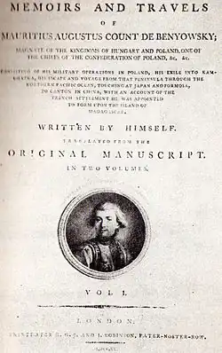 Much of what Benyovszky claimed to have done in Poland, Kamchatka, Japan, Formosa, and Madagascar is questionable at best, but in any case has left no lasting traces in the history of war, exploration, or colonialism.[79] His legacy resides largely in his autobiography (Memoirs and Travels of Mauritius Augustus Count de Benyowsky), which was published in two volumes in 1790 by friends of Magellan, who was by then, as a result of the failed Malagasy venture, in serious financial difficulties. Even at the time of the first publication of the book, it was met with significant scepticism by reviewers.[80][3][81][5] Despite this criticism, it was a great publishing success, and has since been translated into several languages; (German 1790, 1791, 1796, 1797; Dutch 1791; French 1791; Swedish 1791; Polish 1797; Slovak 1808; and Hungarian 1888).[82]