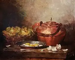 A student of French realist painter Joseph Bail. Monnot presented his works at the Salon des Artistes Français in 1906[2] and at the Salon des Artistes Indépendants in 1913. Monnot was a painter of still lifes and rustic interiors, with his skill at painting reflective copper effects being particularly noted and earning him praise in Paris and the provinces.[1]