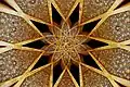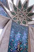 The reconstruction of the mausoleum was commissioned by the Iranian government under Reza Shah in 1934 during Ferdowsi's millenary.[4] Omar's tomb was separated from the shrine, and a white marble monument, designed by Hooshang Seyhoun, was erected over it. The construction was completed in 1963. Seyhoun combined Khayyam's talents as a poet, mathematician, and astronomer in his design.[6] Nizami Aruzi mentioned Khayyam's desire for a grave adorned with blossoms each spring. Seyhoun fulfilled this wish by creating a pathway from the garden to Khayyam's tomb, allowing flowers to fall on it annually. He also paid homage to Khayyam's geometric work with a star-shaped feature on the tomb, opening to the sky above Nishapur and symbolizing the celestial expanse.[6] To further honour Khayyam, Seyhoun decorated the structure with tiles inscribed with Khayyam poems in beautiful calligraphy, featuring Morteza Abdolrasul's abstract Shekaste Nastalik. This project aimed to modernize Iranian architecture while still embracing its heritage, marking a distinct Iranian modernism.[6]