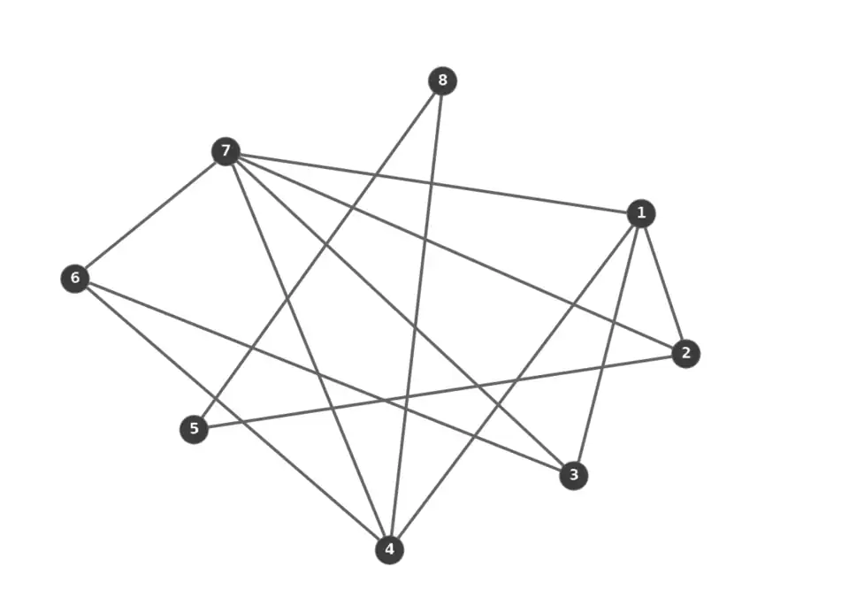 The graph above can be described as a candidate set of vertices R = {7(5), 1(4), 4(4), 2(3), 3(3), 6(3), 5(2), 8(2)}, and used as input for both the approximate coloring algorithm and the ColorSort algorithm. Either algorithm can be used to construct the following table: