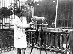 His workshop was located at 30 rue Deparcieux, and he had a small shop located at 100 rue du Théâtre in Paris.[1] Le Verrier's studio created bronze lamps, ashtrays, bookends, desk sets, and hood ornaments; often featuring nude women or animals in an Art Deco style.[3] He used a few different patina styles, included the notable "greenie" style, and often mounted them on Italian marble bases.[3] Besides bronze, he also worked with ivory, zinc, terracotta, and ceramics. He also cast work for other sculptors, including Pierre Le Faguays,[4] Marcel Bouraine,[4] André Vincent Becquerel,[1] and Jules Edmont Masson.[1]