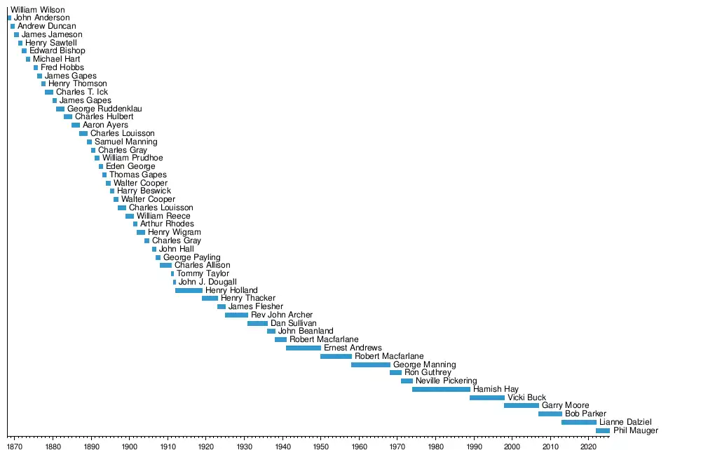 | Robert Macfarlane, 2nd time | 1950–1958 | 13 | George Manning[2] | 1950–1958 | |