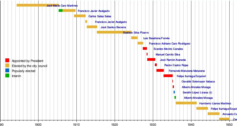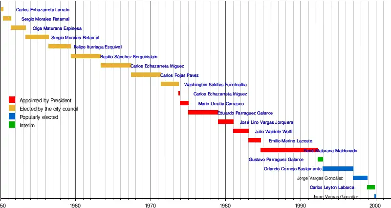 To date, forty-two different individuals have served as mayor of the commune of Pichilemu. There have been 43 mayoralties, excluding those of acting mayors. Francisco Javier Asalgado, Sergio Morales Retamal, and Carlos Echazarreta Iñiguez have served two non-consecutive terms, while Felipe Iturriaga Esquivel served for three. The longest term was that of Roberto Córdova Carreño, who served between December 2008 and June 2021, over twelve years. Before Córdova, the longest term was that of José María Caro Martínez, who served eleven years until his resignation one year before his fourth term expired. The shortest term was that of Gustavo Parraguez Galarce, an acting mayor who served only six days between 6 December and 12 December 2008, before the city council elected Roberto Córdova Carreño as the successor of Marcelo Cabrera Martínez, who was under trial at the time.[16] Excluding Parraguez Galarce, the shortest term of a mayor of Pichilemu was that of Osvaldo Sotomayor Ilabaca, which lasted a span of nine days, between 25 February and 6 March 1935. Only one mayor has died in office: Serafín López Lizana died after serving five months as mayor of the commune. Olga Maturana Espinosa is the only woman to have served as mayor.