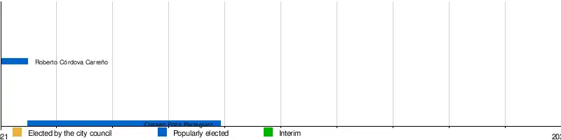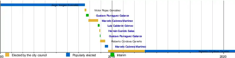 - ^ Following Cabrera Martínez's resignation as mayor to be legally able to be a candidate for the office, he appointed Luis Calderón Gómez as the interim mayor, on 29 September 2008.[56] Since Cabrera was prohibited from using public offices in October of that year, Calderón held the mayoralty until 12 November 2008, when the city council elected Hernán Garrido Salas to complete Cabrera's term, which would last until 6 December.[57]