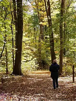 Much of the infrastructure of the park was built by the Civilian Conservation Corps during Franklin D. Roosevelt's New Deal era, and many of the CCC-built structures, retaining walls, and elegant, arched limestone bridges remain in use today. The park entrance gatehouse, former nature center, and a stone arch bridge over McCormick's Creek were listed on the National Register of Historic Places in 1993.[5] There are eight numbered hiking trails in the park, accessing features and park attractions, which include a 90-foot (27 m) fire tower, a scenic ravine and waterfall, small cave, sinkhole formations, and towering stands of second-growth Midwestern hardwoods. The park also features a fine system of equestrian paths.