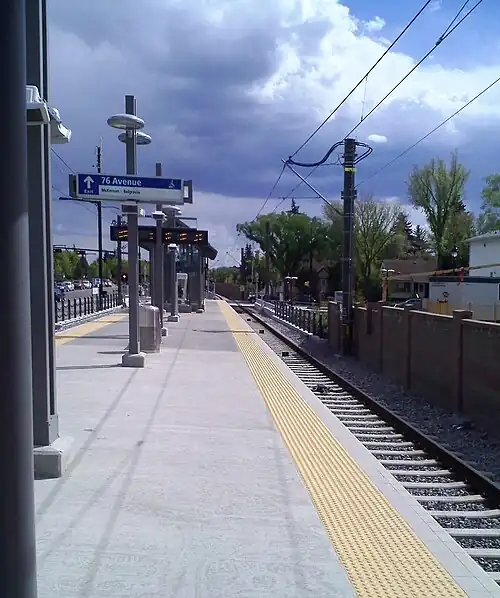 McKernan/Belgravia station is an Edmonton LRT station in Edmonton, Alberta. It is served by the Capital Line, and is the least used station on the LRT system with a typical weekday traffic averaging 4,138 riders as of 2019.[2] It is a ground-level station located on 114 Street at 76 Avenue.