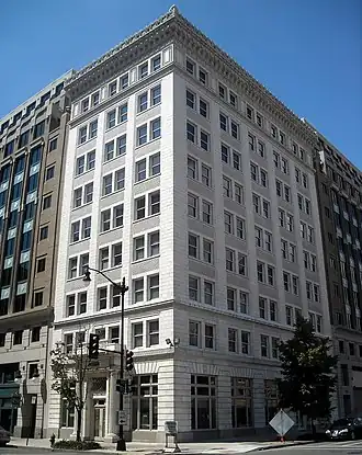 The building was designed by prominent Washington architect Jules Henri de Sibour in the Classical Revival style with elements of the Chicago School.[2] The nine-story structure occupies a corner lot. The exterior of the building is faced with ornamented marble and glazed terra cotta with textured spandrels. It features a Doric entrance and an exuberant cornice.