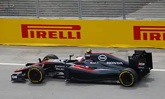 Button scored the car's first points in Monaco, with an eighth-place finish. He later attributed the result to having confidence in the car, noting that he could raise the ride height at the front end of the car and brake heavily without locking the brakes or bottoming out and hitting the road, but without compromising the performance of the car when turning in to the apex of a corner.[72] However, in the following races in Canada and Austria, the team's struggles came to a head as they were forced to reduce the power output of the engine to levels that had not been used since Australia, and could not therefore provide a competitive package for the long straights and slow corners of the Circuit Gilles Villeneuve and Red Bull Ring. In addition, with their arrival in Austria, both Button and Alonso had used up their quota of engine components for the season, which combined with unscheduled gearbox changes, resulted in both drivers receiving twenty-five place grid penalties.[73][74][75][N 2] The team also introduced their first major aerodynamic updates for the season, replacing the snub nose of the original design with a squared-off front end similar to the designs of the Williams FW37 and Red Bull RB11. The rear of the floor was also revised, with a series of slots cut into the body in front of the rear wheels to change the air pressure flowing towards the diffuser.[77] The team only saw limited running as Alonso retired on the opening lap after a collision with Kimi Räikkönen, but they were able to assess the new design at a post-race test. After enduring four consecutive retirements, Alonso scored his first point of the season with a tenth-place finish in Great Britain.[78]