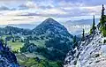 McNeeley Peak (right) and its western sub-peak (left) as viewed from the Huckleberry Creek Trail to the south -