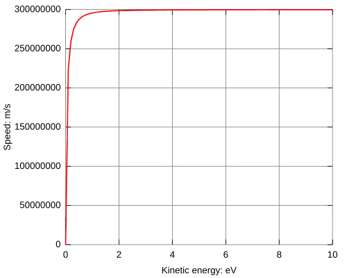 with v being the neutrino speed and c the speed of light. The neutrino mass m is currently estimated as being 2 eV/c², and is possibly even lower than 0.2 eV/c². According to the latter mass value and the formula for relativistic energy, relative speed differences between light and neutrinos are smaller at high energies, and should arise as indicated in the figure on the right.