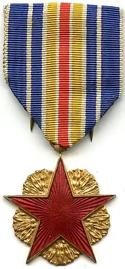 The Medal for the War Wounded (French: Médaille des blessés de guerre) is a military decoration of France. It was originally a mere insignia in the form of an ribbon awarded for wounds received in the line of duty while facing an enemy. The insignia was established by the law of 11 December 1916,[2] based on an idea by the nationalist writer Maurice Barrès. Although originally established as a temporary measure, the insignia survived for a century in some form or another. It could be awarded to wounded soldiers, prisoners of war, to World War II deportees and internees from the French resistance and to soldiers wounded in more recent conflicts.[3] A variety of unofficial medals in the form of a red enamelled star suspended by the same ribbon appeared very early on and although tolerated for wear by the authorities, were not official until recently.