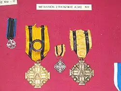 The Medal of Military Merit (Greek: Μετάλλιο Στρατιωτικής Αξίας) is a military decoration of Greece. It was originally created in 1916 for wartime meritorious service, but post-World War II became a peace-time medal reserved for officers. After the abolition of the Greek monarchy in 1974, its design was slightly altered.