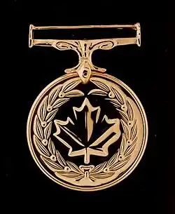 The Medal of Military Valour (French: Médaille de la vaillance militaire) is a military decoration that is, within the Canadian system of honours, the third highest award for military valour,[1] and one of three honours for military valour gifted by the Canadian monarch, generally through his or her viceroy-in-Council. Created in 1993, the medal is presented to both living and deceased members of the Canadian Forces deemed to have carried out "an act of valour or devotion to duty in the presence of the enemy,"[2] and grants recipients the ability to use the post-nominal letters MMV.