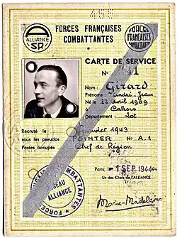 - Resistance member André Girard-Country of Allegiance: France(République française), Free France(La France Libre), Service: French Resistance(La Résistance), French Forces of the Interior(Forces françaises de l'intérieur), Rank: Voluntary Combatant of the Resistance (Combattante Volontaire de la Résistance)