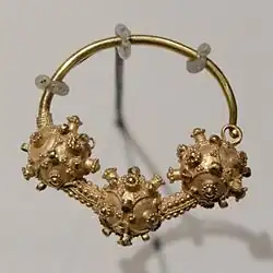 Filigree and granulation are two processes that are also closely related. They involve the decoration of a sheet of gold using the application of wires or grains of gold which can be worked into very intricate patterns.[36] These techniques allowed for intense detail and delicacy because the wires or grains could easily be worked into twisted patterns and minuscule facets.[37] All of these techniques enabled detailed work on gold jewelry, adding other materials or fine details.