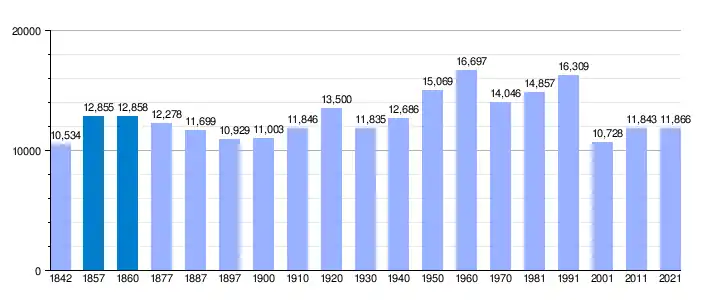 | demographic vertical bar chart of Medina-Sidonia[6] between 1842 and 2021 |