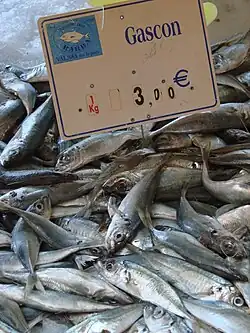 The Mediterranean horse mackerel is an important resource in the Mediterranean Sea and the Black Sea region.[6] It makes up 54% of catches in the Black Sea and 39% in the Sea of Marmara. In the Aegean and Mediterranean Seas, it only totals 3–4% of annual catches. Fixed nets and seines are common methods used to catch Mediterranean horse mackerel.[1] Along with T. trachurus, it is one of two Trachurus species in the Mediterranean. Because it forms dense schools and lives in shallower waters, the Mediterranean horse mackerel is the more commonly caught species.[11] Along with Engraulis encrasicolus, it makes up 59% of seafood production in Turkey.[9]