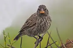 Urbanization is not the only factor affecting medium ground finches; drought and character displacement can also act as a selective pressure that can drive evolution of medium ground finches. In 1977, a severe drought reduced the supply of seeds in the Galápagos.[11] The finch on Daphne Major, which normally preferred small and soft seeds, was forced to turn to harder, larger seeds. This strong selective pressure favoring larger beaks, coupled with the high heritability of traits relating to beak size in finches, caused the medium ground finch population to experience evolution by natural selection, leading to an increase in average beak size in the subsequent generation. A second drought of 1984-1986 caused a similar change, made more apparent by having smaller birds with bigger beaks.[12]
