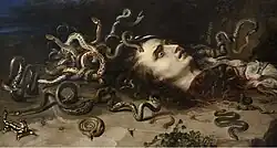Medusa, or sometimes referred to as The Head of Medusa, was created c.1618 using oil on canvas and is 68.5 x 118 cm.[5] Rubens enlisted the help of Frans Snyders who worked with him multiple times. Snyders was a nature artist and worked with Rubens to paint animals in his pieces, such as the snakes in Medusa.[5] The snakes portrayed are nonvenomous European grass snakes, except for the two snakes on the right side of her head which are vipers.[5] Vipers are a medieval symbol of ungratefulness.[5] In Greek mythology, Medusa is portrayed as having venomous snakes for hair.[6] The vipers are shown mating with the female having the male's head in her mouth. Towards the middle of the painting, an amphisbaena is shown. An amphisbaena is a snake-like creature that has two heads, one on each end of its body, and is noted in classical mythology.[7] In Greek mythology, amphisbaenas are made from the blood of Medusa and feed on decaying bodies.[5] Medusa is shown to have just been slain and is laying down in a pool of blood with the snakes and reptiles surrounding her.