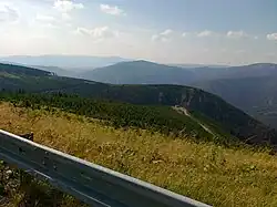 ![]() View from the I/44 road on the slope of Velký Klínovec mountain to the top of Medvědí hora and Dlouhý vrch (on the left, the slope of Hřbety–JZ mountain) | |