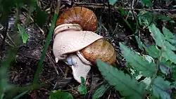 Megalobulimus dryades is a large terrestrial snail, characterized by its relatively thick, heavy shell with up to 5.4 whorls. Adult individuals have shells that can reach up to nearly 120 mm (4.7 in) in length and about 75 mm (3.0 in) in width.[2] The shell is ovate-conical in shape, slightly compressed dorsoventrally, with a short spire and a relatively wide body whorl. It has a reddish ocher coloration, with a yellowish‑white subsutural band that goes from the initial to the last whorl.[2] Growth lines are visible, but the shell surface appears relatively smooth to the naked eye, except for characteristic pronounced rugosities that produce a malleated aspect on the teleoconch whorls.[2] The shell's surface is covered by a thin, slightly glossy periostracum, an outer organic layer that protects the underlying shell.[7] It is yellowish-brown with darker vertical bands, and is often darker colored in the shell's surface depressions formed by its marked rugosities. It is usually lost (peeled off) on the initial whorls in adult animals, but preserved on the last two teleoconch whorls.[2]