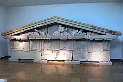 The Megarian Treasury was mainly built from limestone, with the roof made of terracotta tiles. The building was adorned with several statues, including limestone reliefs and carvings in cedarwood.[2] Due to its architectural styling, both the statues and the building itself are believed by archaeologists to originate from the 500s BCE.[3]