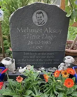 On the day of Aksoy's initial mourning service in Derik in northern Syria in early October 2017, more than 2,000 people turned up at the Kurdish Community Centre in Haringey to pay tribute.[15][7] On 25 October, his body was returned to his family in the UK.[14] He was buried on the eastern side of Highgate Cemetery in London on 10 November 2017. The funeral ceremony, coinciding with the London celebrations of the annual World Day for Kobani,[16] included live video speeches by YPG spokespeople Nesrin Abdullah and Nuri Mahmoud, and a minute of silence at the grave of Karl Marx.[18][15] The occasion also ignited pro-Kurdish demonstrations throughout Turkey and Germany.[19]