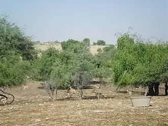 Mehrano Forest is home to approximately 4,000 big game animals, including blackbuck, Indian gazelle, hog deer, wild boar.[3][4][5] Additionally the forest lake boasts resident and migratory birds from Siberia and Europe. There is a reserved place for tourists to see wild boars. Mir Ali Murad Khan Talpur II, head of the royal house, has forbidden all hunting except of the jackal and an annual culling of wild boars which become a mortal threat to adjacent farmers and their families when boar populations become too large for the forest to hold. The Mehrano reserve shares its boundary with the Cholistan desert.[6]