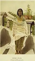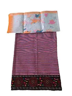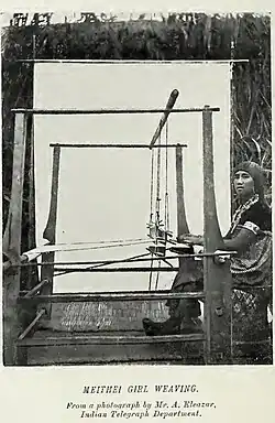 The dress of the women consists of a striped cotton or silk cloth passed round the body under the armpits and over the breast, a jacket, and a sheet.[1] The dress of the women when of good quality is picturesque and pleasing. During the hot weather, it consists of a piece of cloth open except at the bottom, where it is stitched together by the edges for a few inches; this is folded round the body, under the armpits and over the breast, and tucked in by the hand at the side of the body. In length, it reaches the ground, but as this would be inconvenient in walking, it is hitched up about halfway to the knee, and tucked in again at the waist.[1] This piece of cloth, called a fanek or phanek, is only wide enough to go one and a half times round the body; this gives enough room, however, for the legs in walking. The phanek or fanek (Meitei: ꯐꯅꯦꯛ) is made in cotton and silk, and the only patterns are stripes of various colours and widths running across the material, the groundwork being of different colours. The commoner patterns are red with green stripes, green and black, blue with black and white stripes, yellow and brown, dark blue with green and white stripes, etc. At the top and bottom of the garment is a broad margin, on which geometrical figures or patterns of various kinds are sewn by hand with floss silk in various colours. Over the phanek or fanek is worn a white sheet, which is folded in the usual native manner, the face, however, being left uncovered. In the cold season a short jacket with long sleeves is worn; this reaches below the bust over the phanek or fanek, and is worn tight fitting. The material is usually velvet or satin, black, blue, or green being the favourite colours. Female children, until puberty, or near it, wear the phanek or fanek round the waist, the upper part of the body being bare.[1]