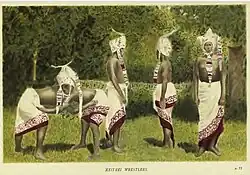 The national sports and games of Meitei kingdom afford an opportunity for special and elaborate costumes. On the occasion of the great annual boat-races, in which in former days the kings used to take part, the steersmen of the competing crews wear a khamen chatpa loincloth (Meitei: ꯈꯥꯃꯦꯟ ꯆꯠꯄ), and to add to the dignity of the high-coiled headgear with fringed ends permitted to them, they wear feathers of the Argus pheasant or of the Hume's pheasant, with blossoms in long trailing coils of the blue orchid (Vanda coerulea). The wrestlers wear the khamen chatpa loincloth and the curious head-dress, which has a portion twisted up in front. The costume of the polo (Meitei: ꯁꯒꯣꯜ ꯀꯥꯡꯖꯩ, romanized: Sagol Kangjei) players is more practical, and consists of a short jacket of dark velvet, worn even in hot weather, a loincloth, generally of white cotton, and quilted leggings of a stout and serviceable nature. The headgear is fastened in such a way as to protect the ears and side of the head from blows, and if not particularly picturesque, is at any rate of great use, for in the heat and fury of the game the players become excited, and some people think that if they cannot hit the ball, they may as well hit the man.[1]