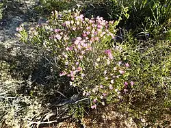 The flowers are arranged in heads at the ends of branches, with the branch continuing to grow after flowering. Each head has 1 to 4 groups of flowers in pairs or threes. The stamens are arranged in five bundles around each flower, 6 to 12 stamens per bundle, coloured pink, purple or magenta. Flowering occurs in September and October and the fruit which follow are woody capsules 4.8–6.5 mm (0.2–0.3 in) long.[2][3]