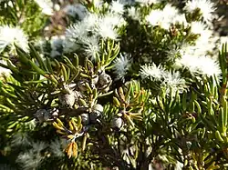 The flowers are white and arranged in heads or spikes on the ends of branches which continue to grow after flowering and sometimes in the upper leaf axils. Each head or spike contains 3 to 9 individual flowers and is up to 20 mm (0.8 in) in diameter. The stamens are arranged in five bundles around the flowers and there are 12 to 16 stamens per bundle. The main flowering period is from September to January and is followed by fruit which are woody capsules 4–5.5 mm (0.16–0.22 in) long.[2][3]